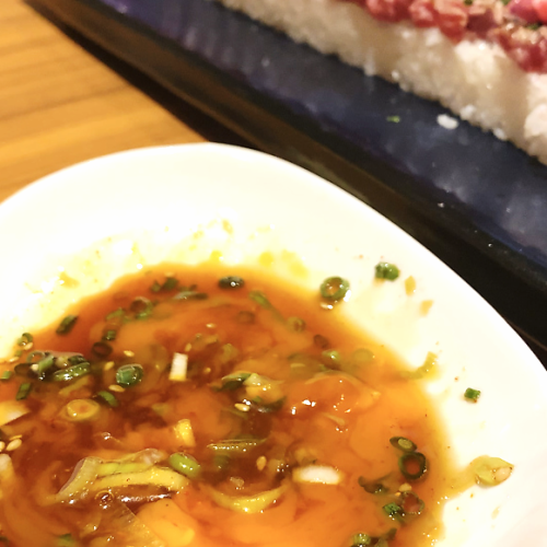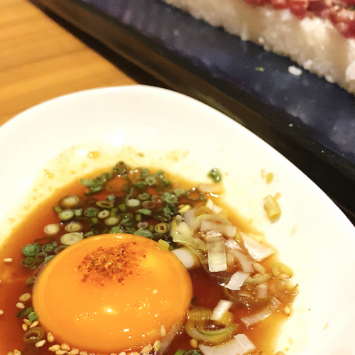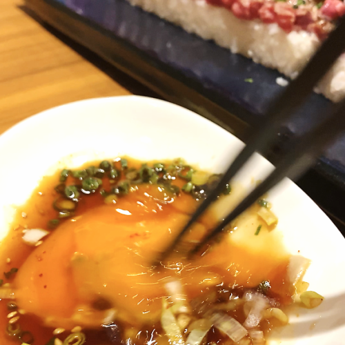 タレには卵の黄身、刻み葱、、